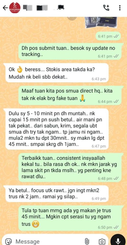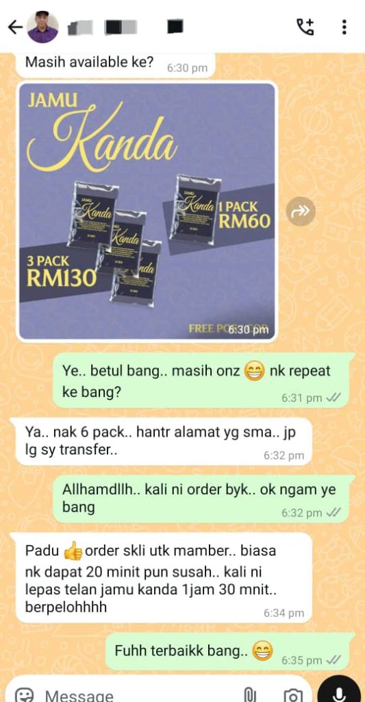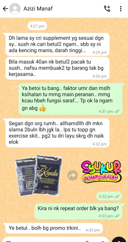 Jika anda menghadapi masalah seperti cepat tewas, tak keras, Boboi kecik , atau mati pucuk, Jamu Kanda adalah penyelesaian terbaik untuk anda! Dengan formulasi herba semulajadi yang diwarisi turun-temurun, Jamu Kanda membantu mengatasi masalah anda secara menyeluruh, tanpa kesan sampingan. Kini masanya untuk anda kembali menjadi Lelaki yang gagah perkasa.